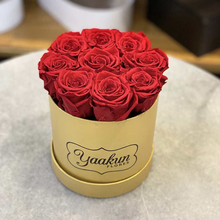 Caja circular chica dorada con 9 rosas rojas aproximadamente