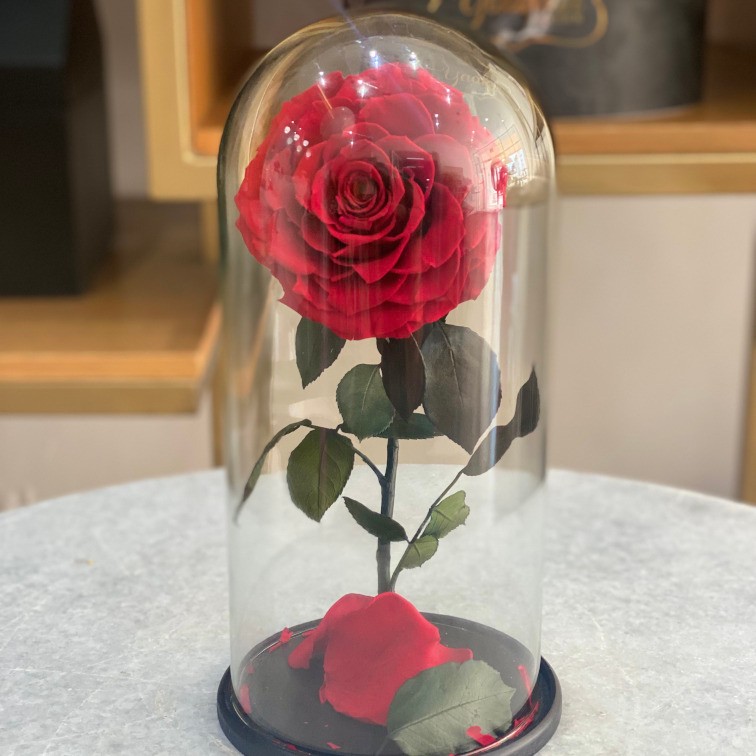 Elegante diseño floral con una rosa eterna en color roja con cúpula de cristal