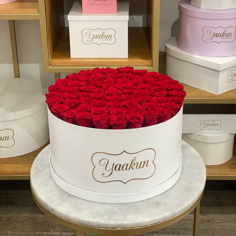 Hermosa diseño de rosas eternas rojas en caja circular.