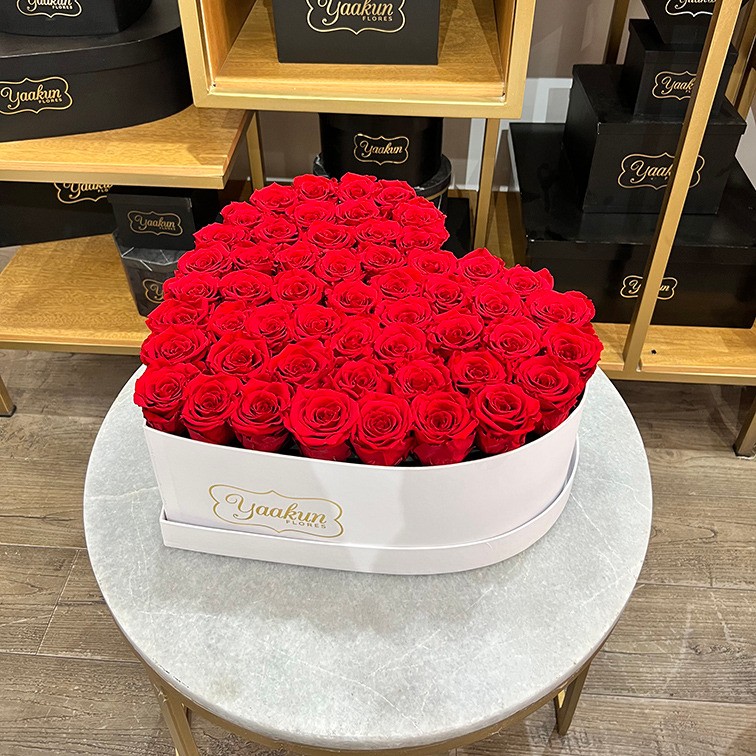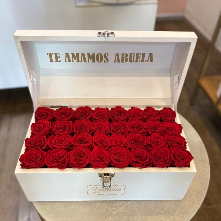 Hermoso arreglo floral con 32 rosas eternas en color rojo