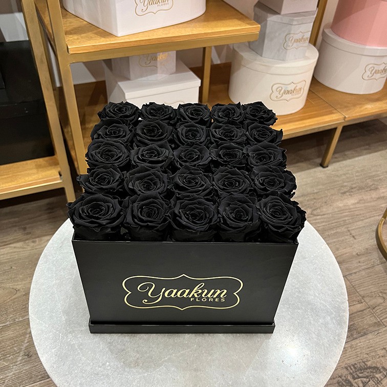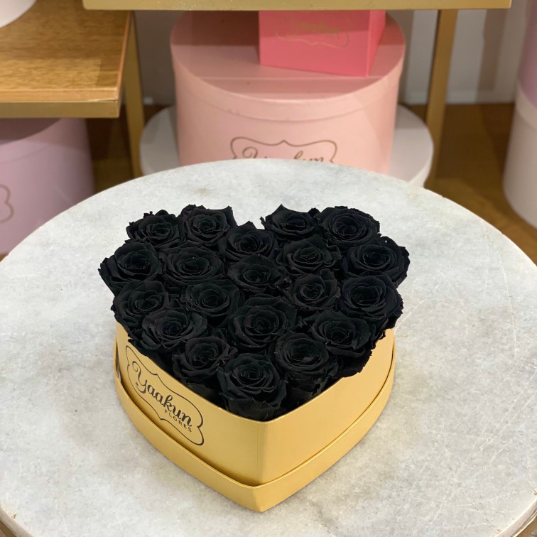 Hermoso y clásico arreglo floral con 27 rosas negras aproximadamente en caja dorada en forma de corazón
