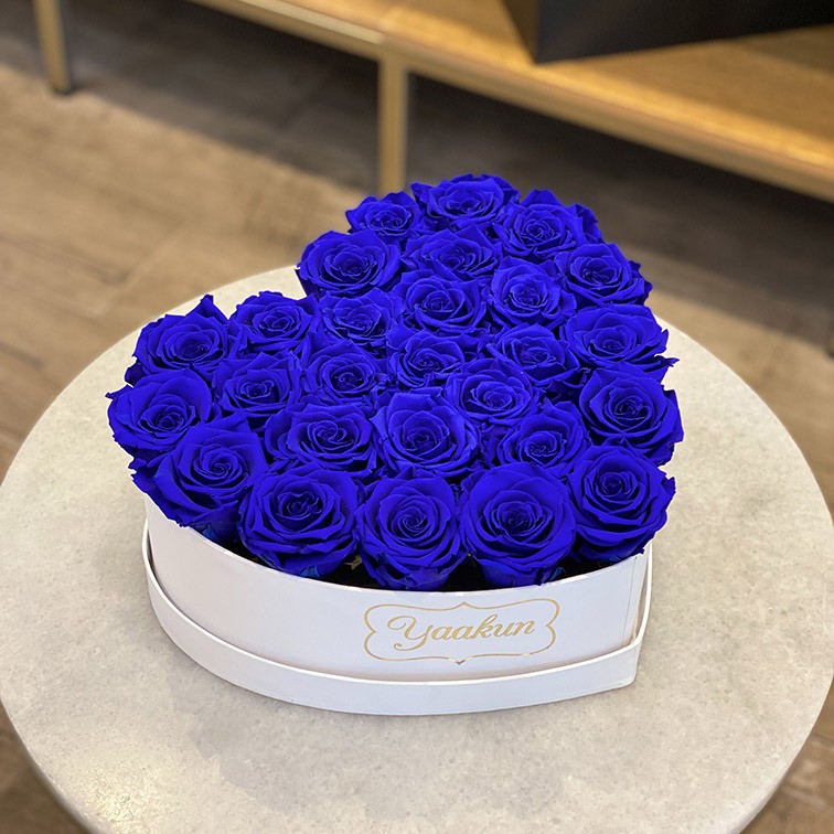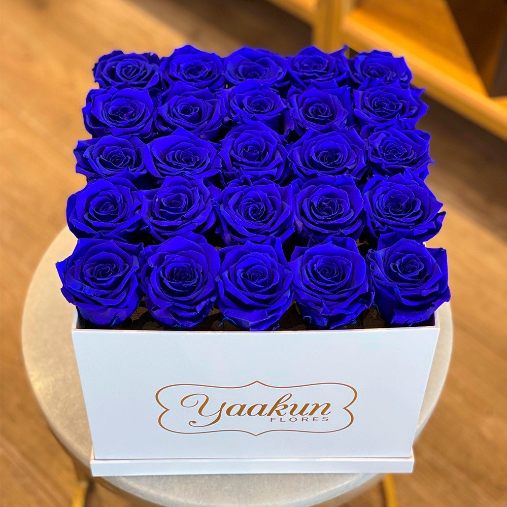 Hermoso diseño en caja blanca de cartón rígido con 27 rosas eternas aproximadamente en color azul