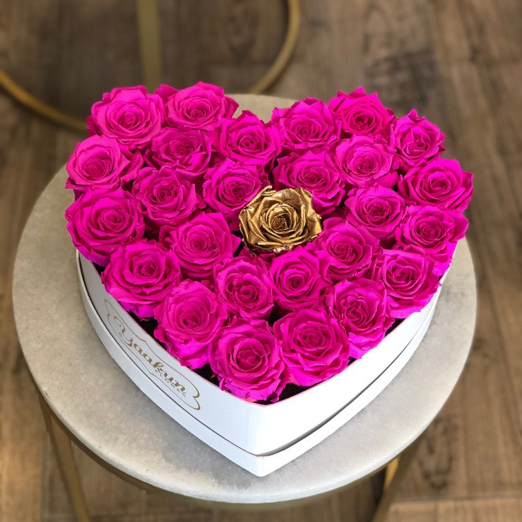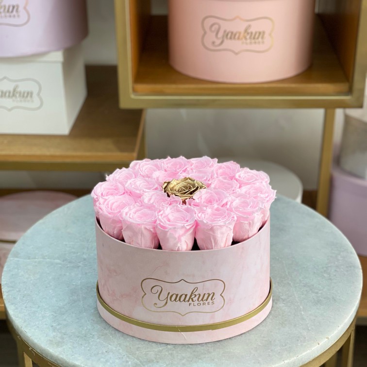 Caja circular blanca con 36 rosas eternas aproximadamente en color fucsia