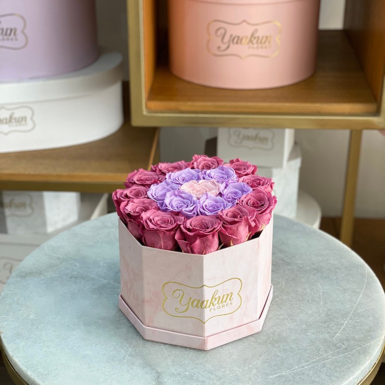 Hermoso diseño floral con 18 rosas eternas en tonos lila , rosa palo y rosa pastel.