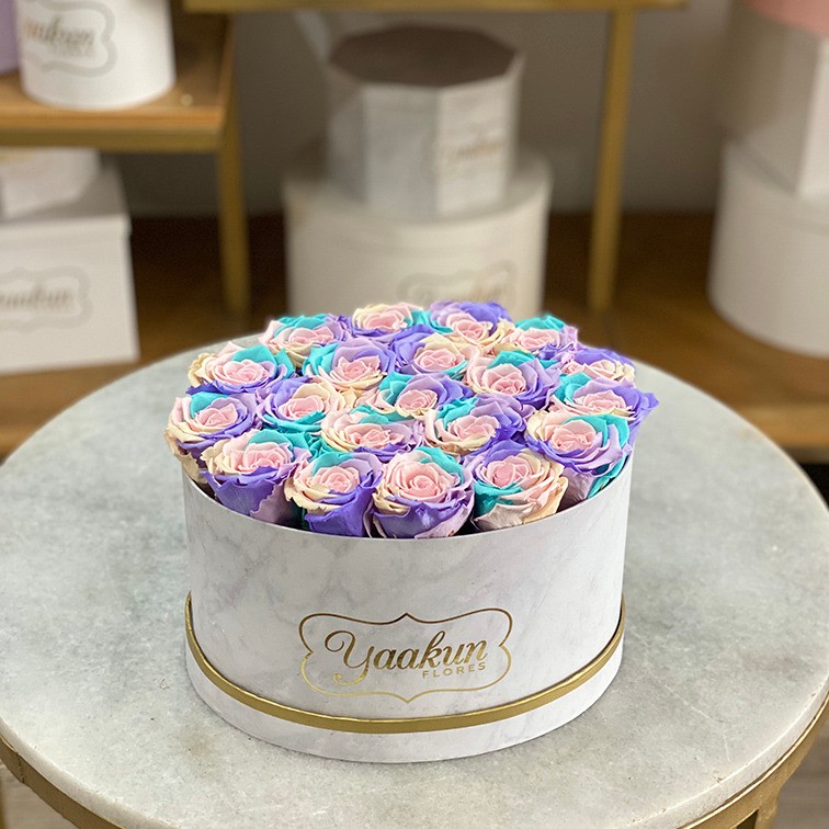 Caja ovalada blanca con 20 rosas eternas aproximadamente en tonos arcoíris en tonos pastel