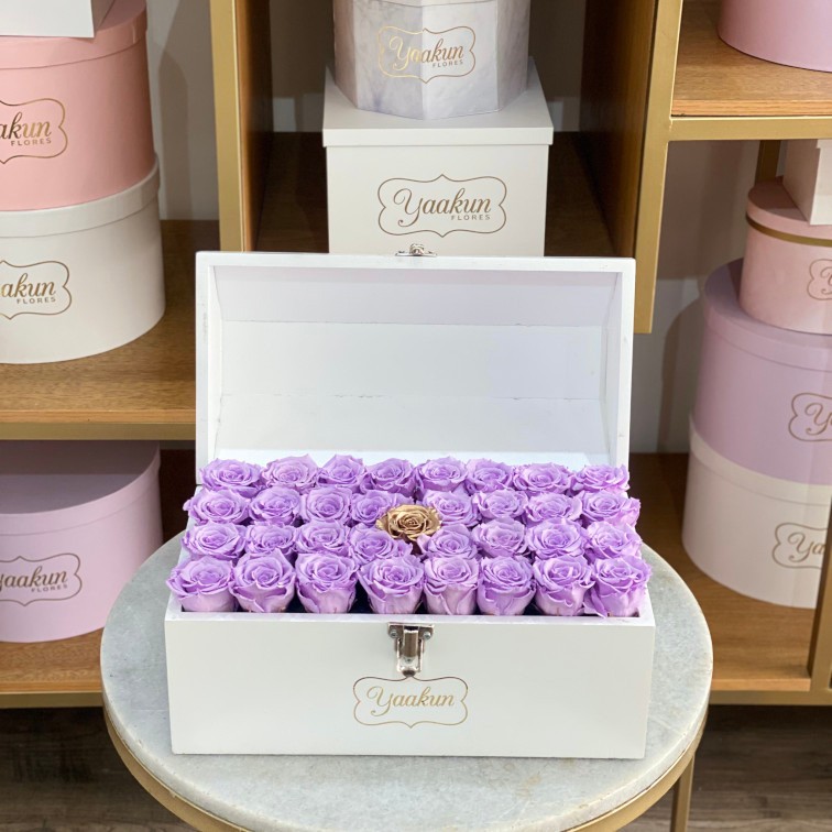 Hermosa caja blanca con 25 rosas eternas blancas.