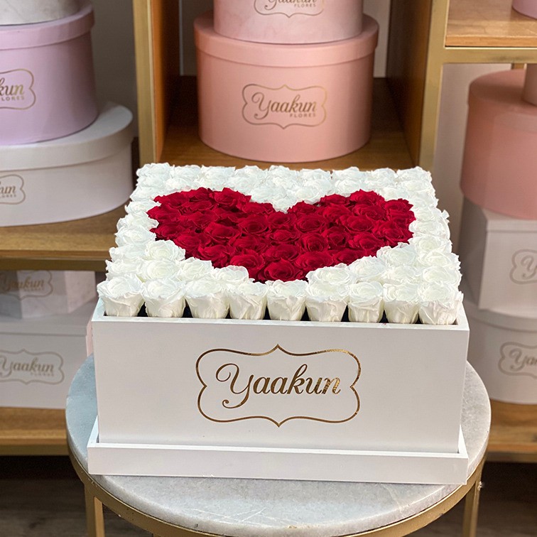 Hermoso diseño floral con 81 rosas eternas aproximadamente en caja de madera cuadrada blancas corazón rojo.