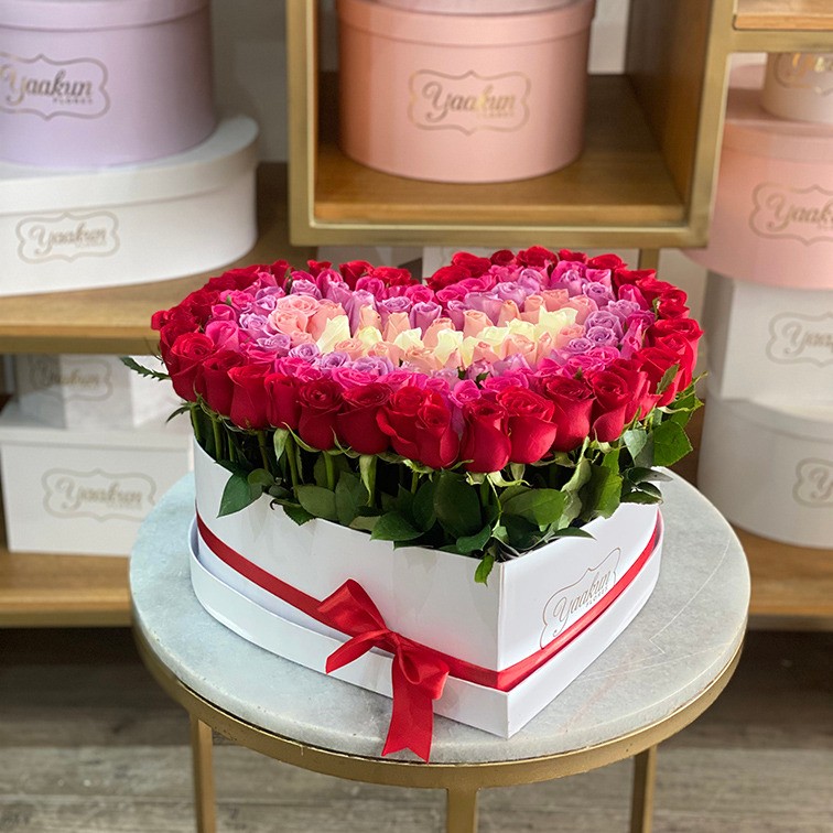 100 rosas con tallo alto en efecto degradado con varias tonalidades en caja en forma de corazón