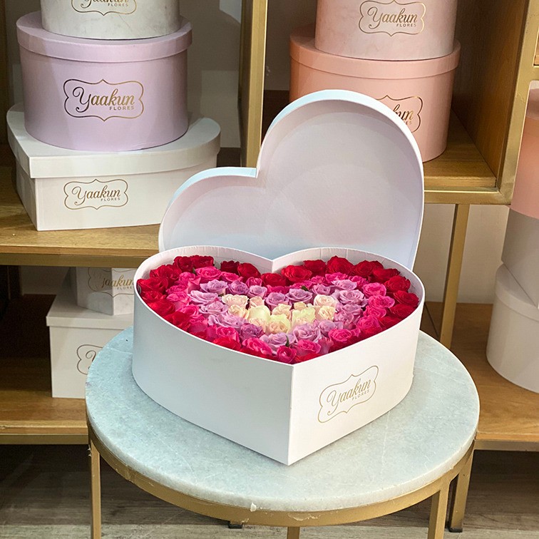 100 rosas en efecto degradado con varias tonalidades en caja en forma de corazón con tapa