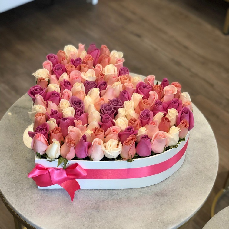Original caja en forma de corazón con 100 rosas en tonos pastel.