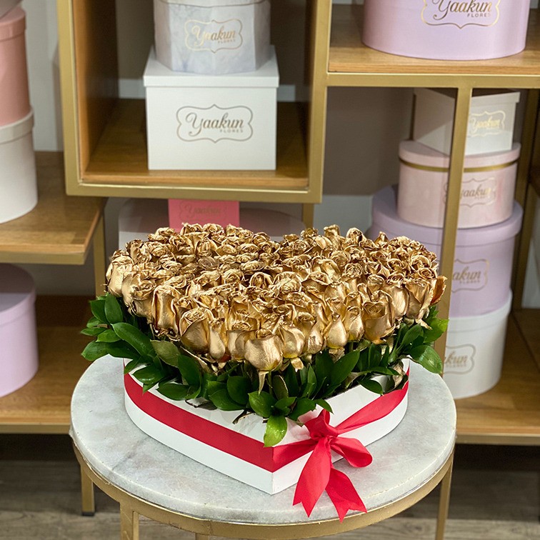 Elegante corazón de 100 rosas gold en caja en forma de corazón tipo jardín con listón rojo.