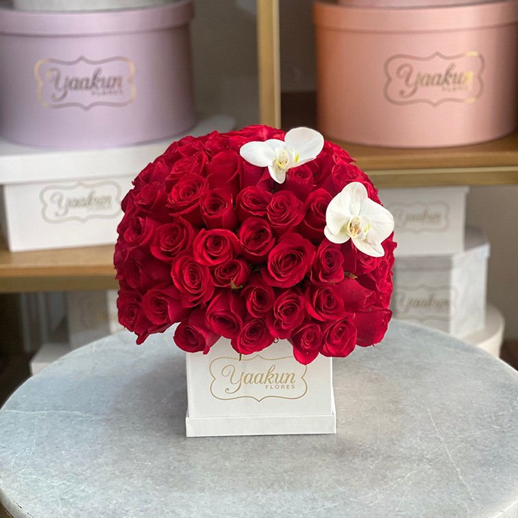 Mini caja Yaakun en color blanco con 100 rosas rojas y 2 orquídeas phalaenopsis.