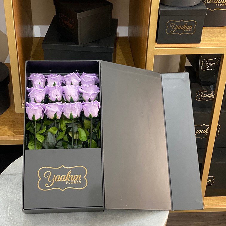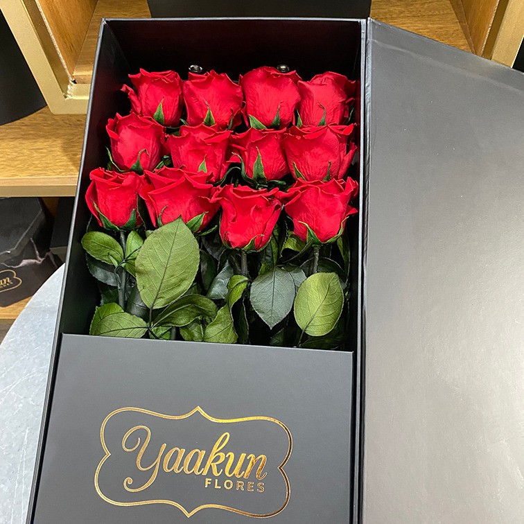 Hermoso y clásico detalle floral con 12 rosas eternas rojas en una elegante caja de cartón rígido en color negro