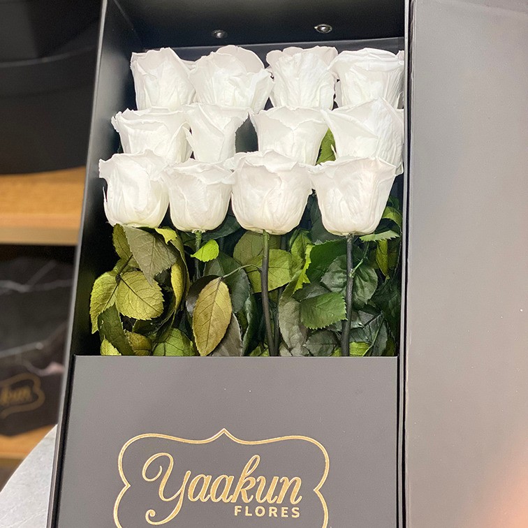 Hermoso y clásico detalle floral con 12 rosas eternas blancas en una elegante caja de cartón rígido en color negro