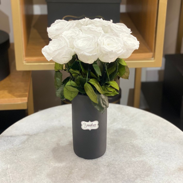 Hermoso y elegante diseño floral con 12 rosas eternas rojas que pueden llegar a durar de 1 a 2 años dependiendo del cuidado