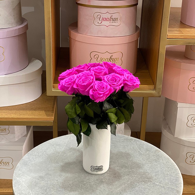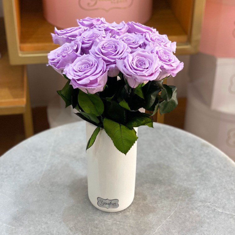 Hermoso y elegante diseño floral con 12 rosas eternas lilas que pueden llegar a durar de 1 a 2 años dependiendo del cuidado