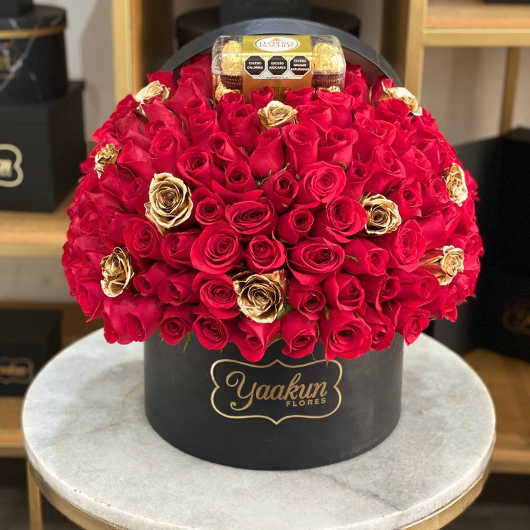 Hermosa caja negra con 140 rosas rojas con toques dorados y una caja de chocolates Ferrero Rocher