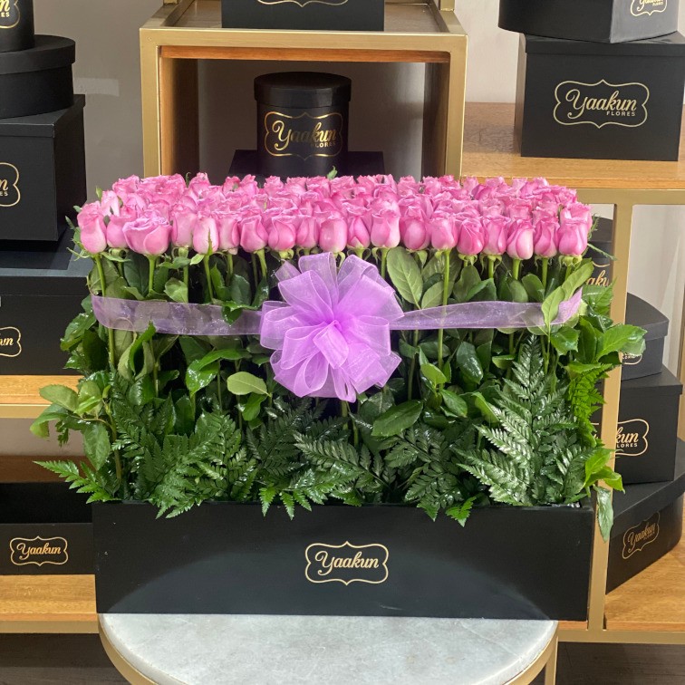 Hermoso y clásico arreglo floral en caja negra con 150 rosas lilas