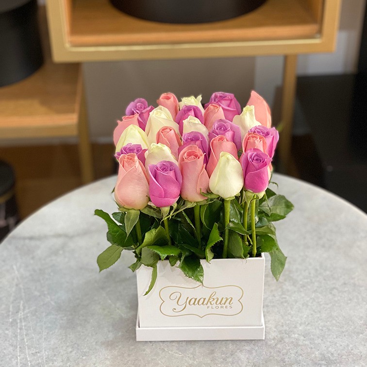 Bello diseño de jardín con 25 rosas en tonos pastel con calidad de exportación en una caja blanca.