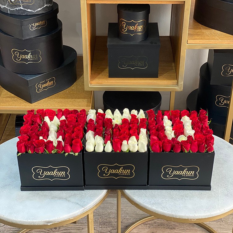 Perfecto para un aniversario o fecha especial, este extraordinario diseño floral consta de 3 cajas Yaakun en color negro con la frase “I Love You” hecha con 225 rosas blancas y rojas.