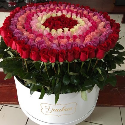 Hermosa caja circular con 300 rosas aproximado en vibrantes colores formando círculos.