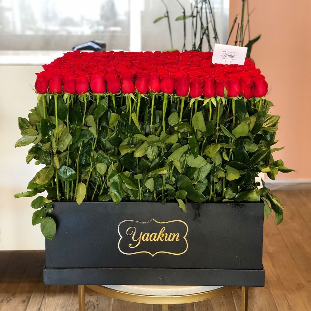 Obséquiale el regalo más espectacular. Esta hermosa caja de madera tiene una medida de 60 cm x 60 cm y contiene 300 rosas rojas de exportación montadas tipo tapete.
