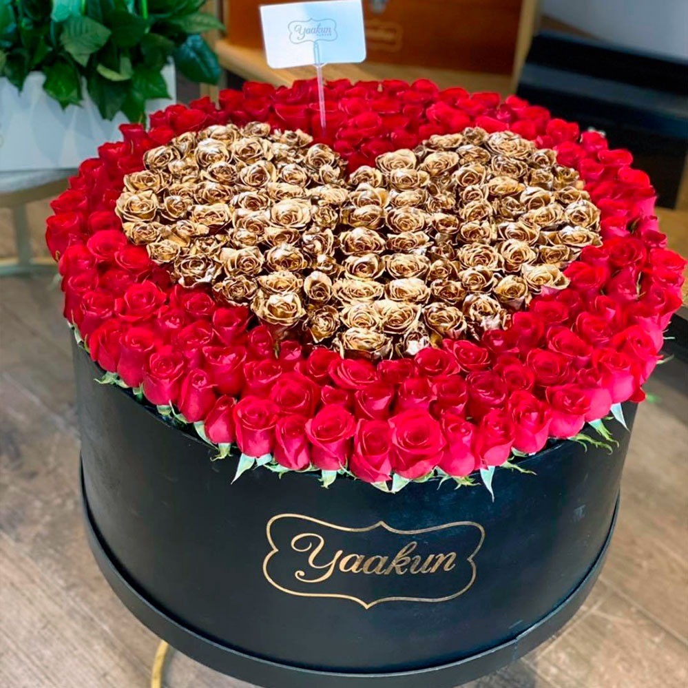 Hermosa caja circular en color negro, con rosas doradas en forma de corazón y contorno con rosas rojas,
