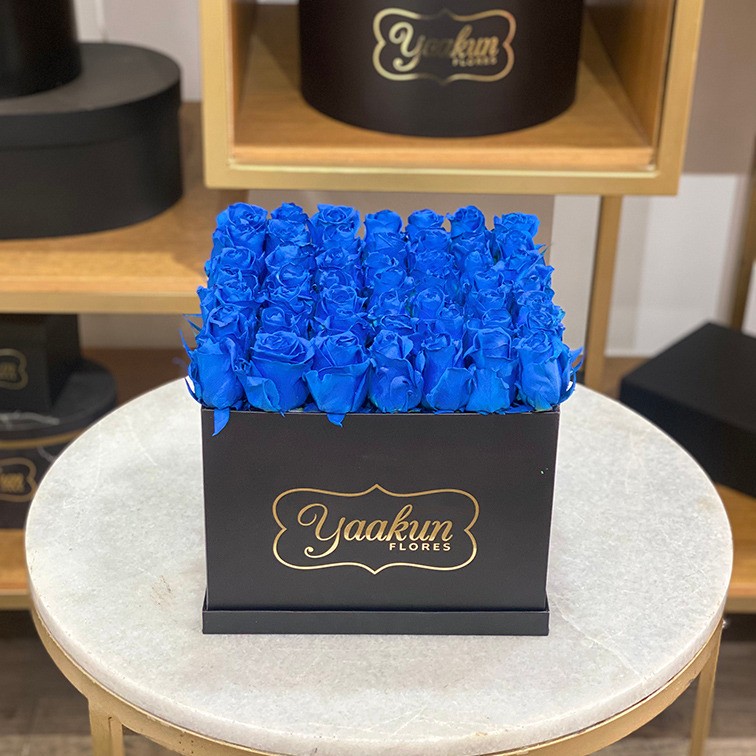 49 rosas azules dentro de una caja en color negro.