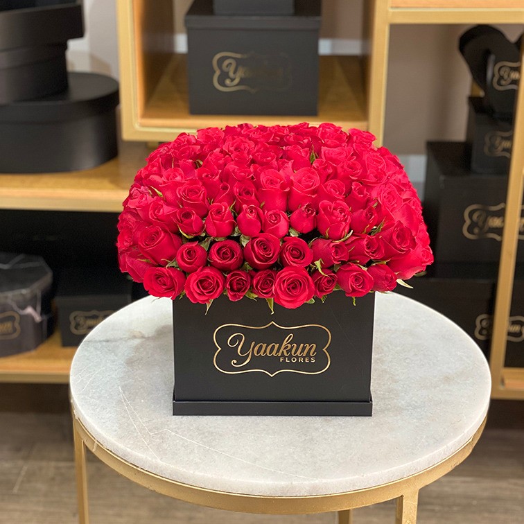 Perfecto diseño elaborado con 120 rosas rojas sobre una caja en color negro.