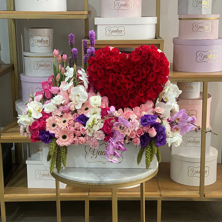 Arreglo florar en caja blanca con un corazón de 100 rosas rojas, orquídeas phalaenopsis , gerberas y follajes de temporada.