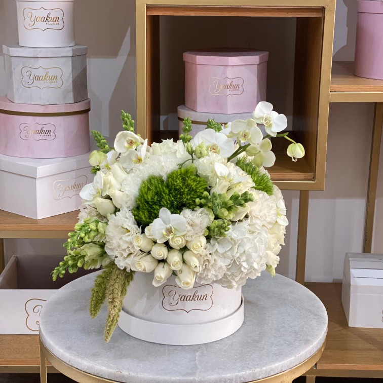 Caja circular en color blanco con 75 rosas, lisianthus y orquídeas con follaje fino.