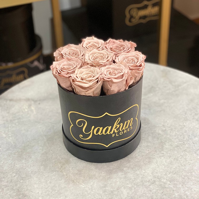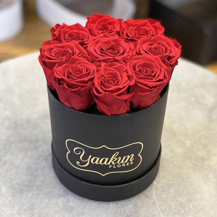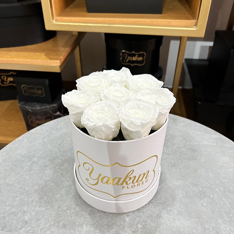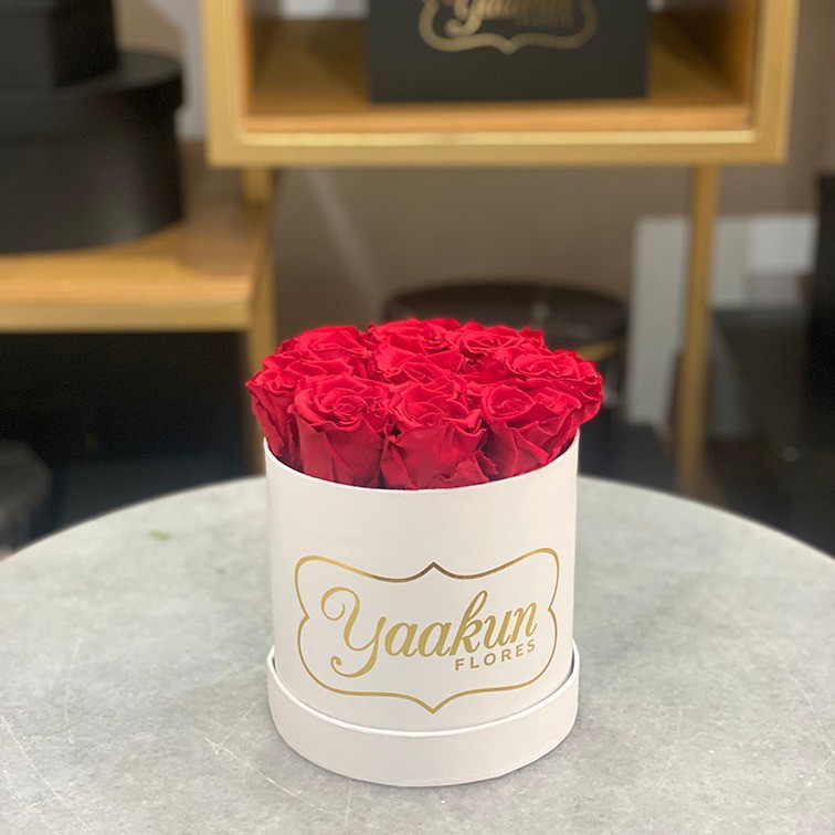 Caja circular chica blancos con 9 rosas rojas aproximadamente. Rosas preservadas o eternas esto quiere decir que es una flor 100% natural , que mediante un proceso de liofilización se logra extraer el agua para lograr que lleguen a durar más de un año.