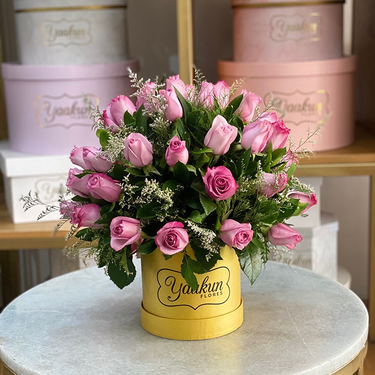 Hermoso diseño floral con 40 rosas lilas y follajes en una caja circular dorada de cartón rígido.