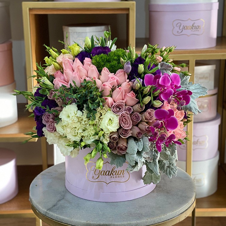 Elegante diseño floral en caja circular blanca con tonos lila con rosa (150 rosas), lisianthus baby rose y orquídea phalaenopsis.