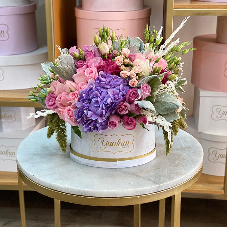 Hermoso y tierno diseño floral con tonos rosas y morados ,con 50 rosas, lisianthus, hortensias, miller, limonium deshidratado, cola de zorra y baby rose