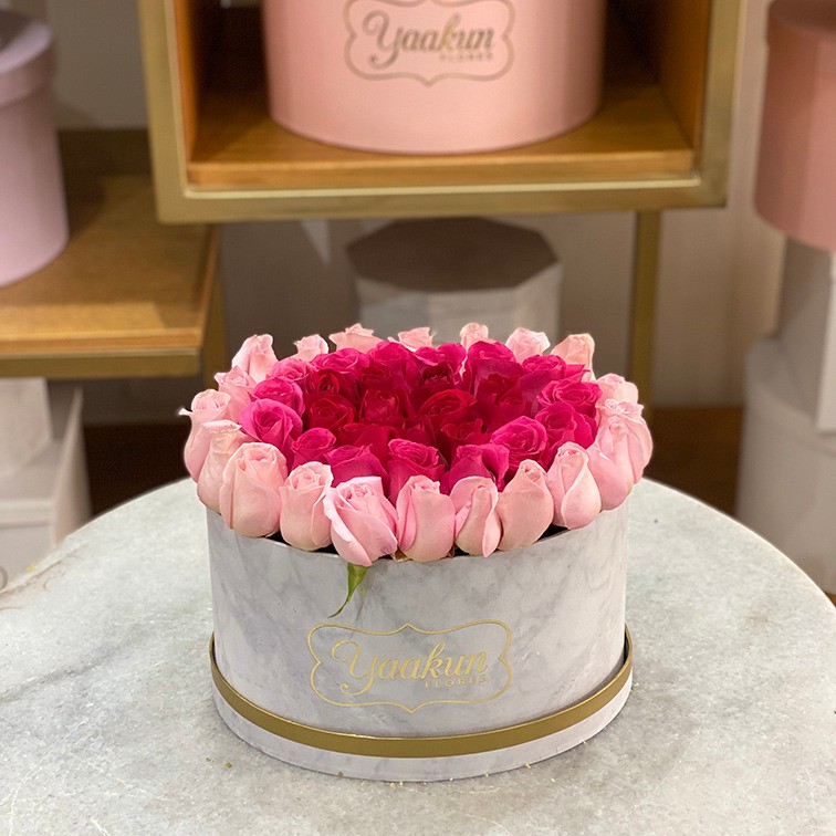 Caja ovalada blanca con rosas degrade la cantidad de rosas puede variar dependiendo el tamaño