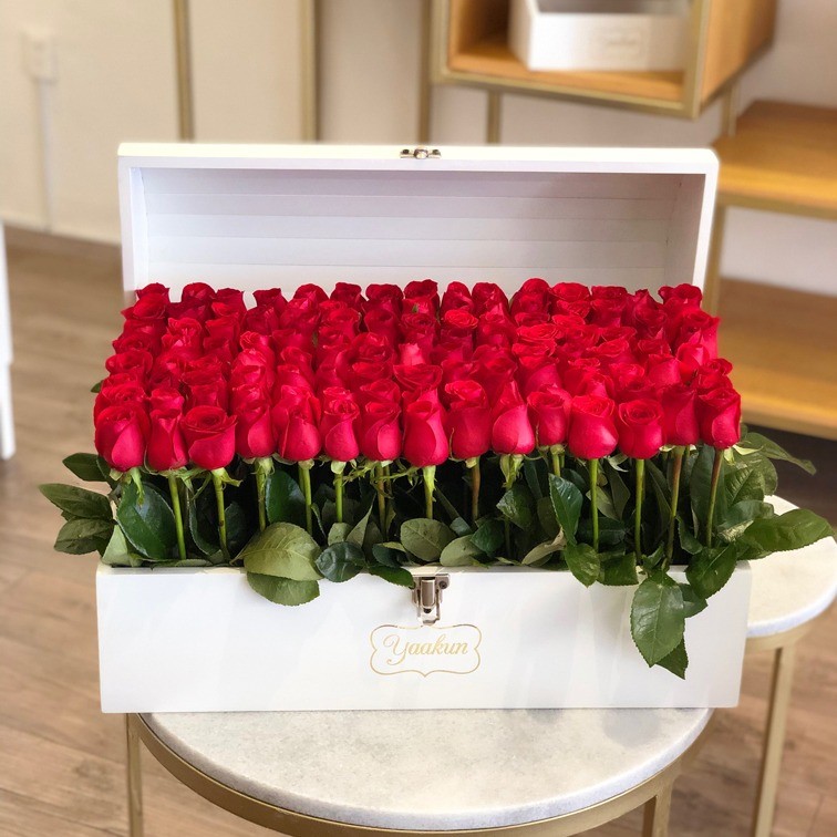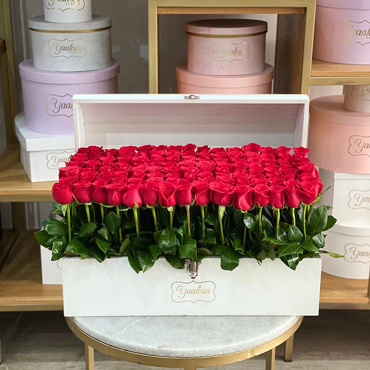 Romántico cofre blanco con 130 rosas rojas de exportación.