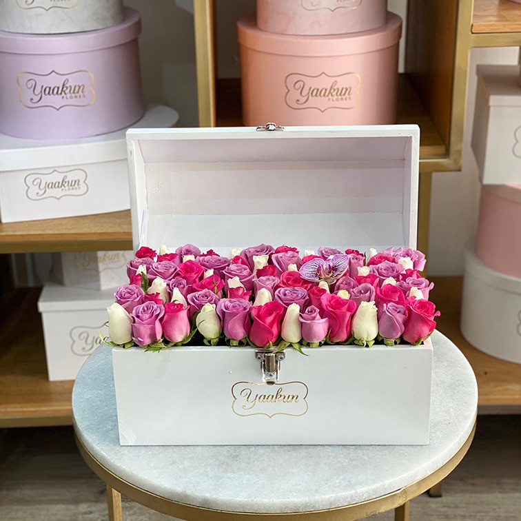 Dale una romántica sorpresa a tu ser amado con este cofre en color blanco con 70 rosas en 5 tonalidades y una orquídea phalenoxis.