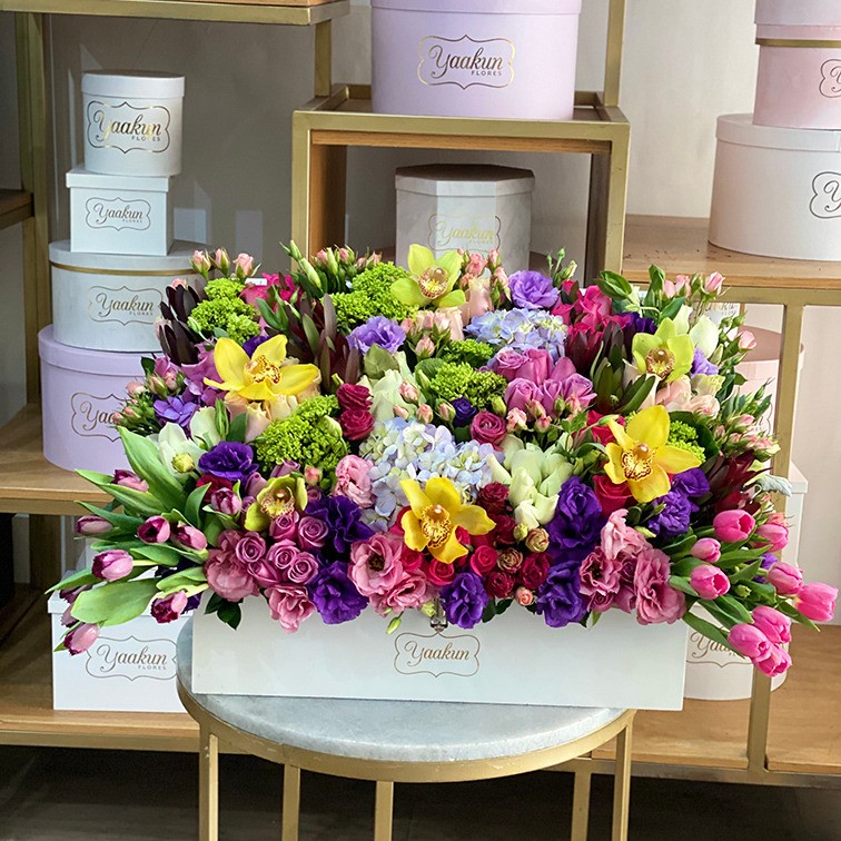Hermoso y colorido arreglo floral en un cofre blanco con 100 rosas, 20 tulipanes y follajes como hortensia, miller, safari, baby rose y lisianthus