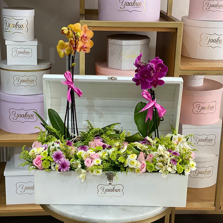 Hermoso cofre grande blanco con flores primaverales , 25 rosas y orquídeas.