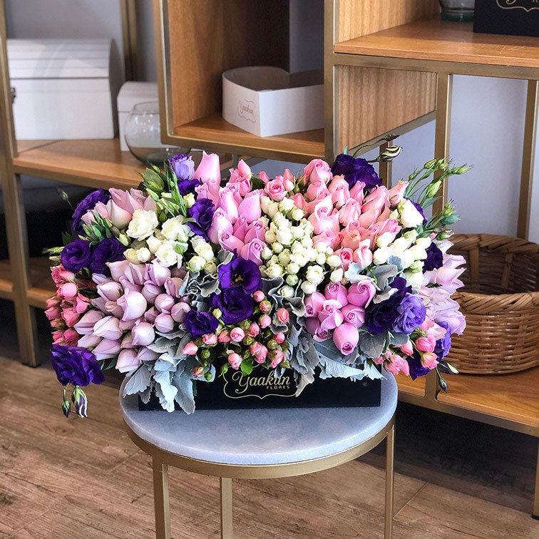 Hermoso diseño floral en un cofre mediano en tonos rosas y morados con 100 rosas , baby rose , lisianthus y Miller .