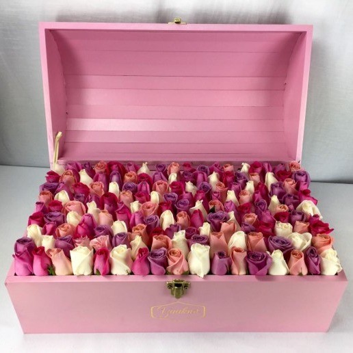 Manda una hermosa felicitación en tonos rosas, este cofre en color rosa está diseñado para las personas más dulces. Consta de rosas de exportación en tonos pastel con una tarjeta de dedicatoria.
