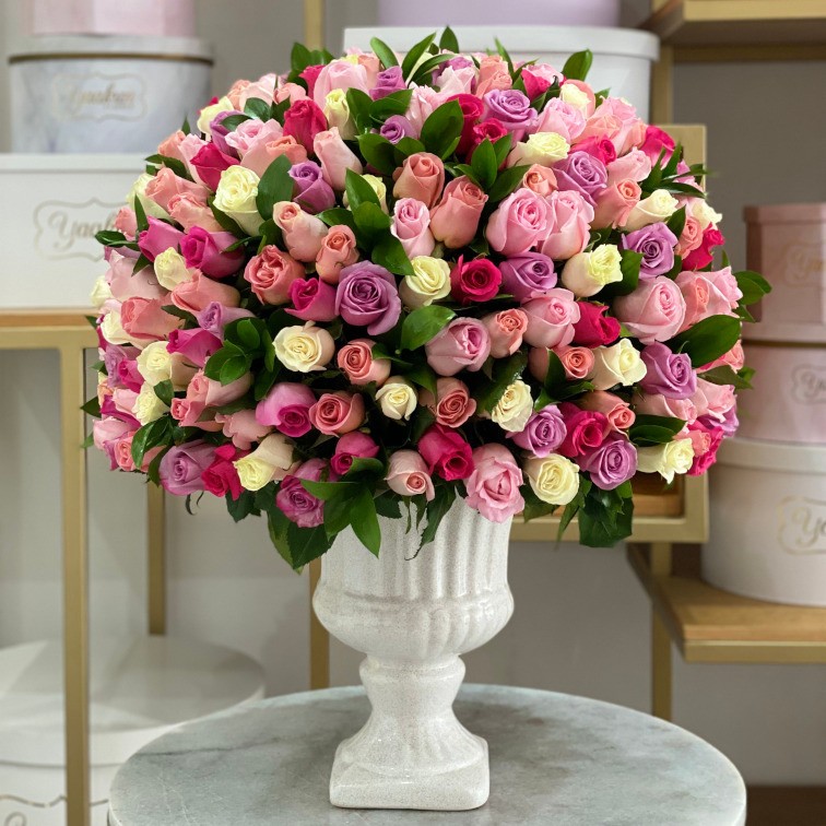 Hermoso y tierno arreglo floral con 300 rosas en tonos rosas y follaje de ruscus en copa tipo cerámica