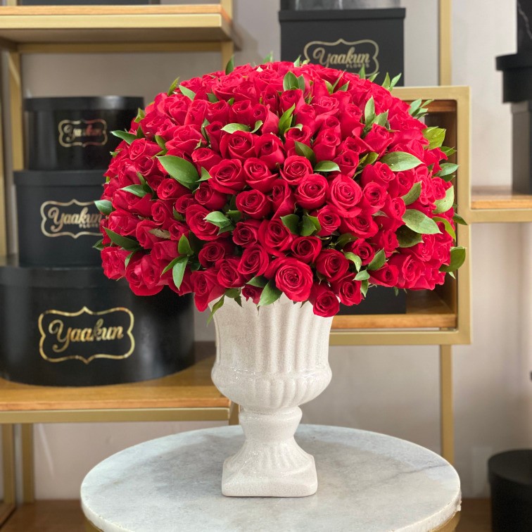 Hermoso y elegante arreglo floral con 300 rosas rojas en copa romana tipo cerámica