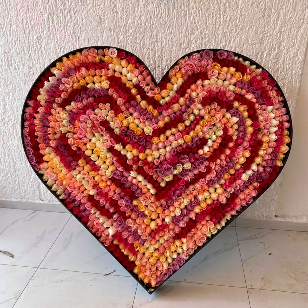 Corazón fiesta de colores elaborado con 1000 rosas en distintos colores.