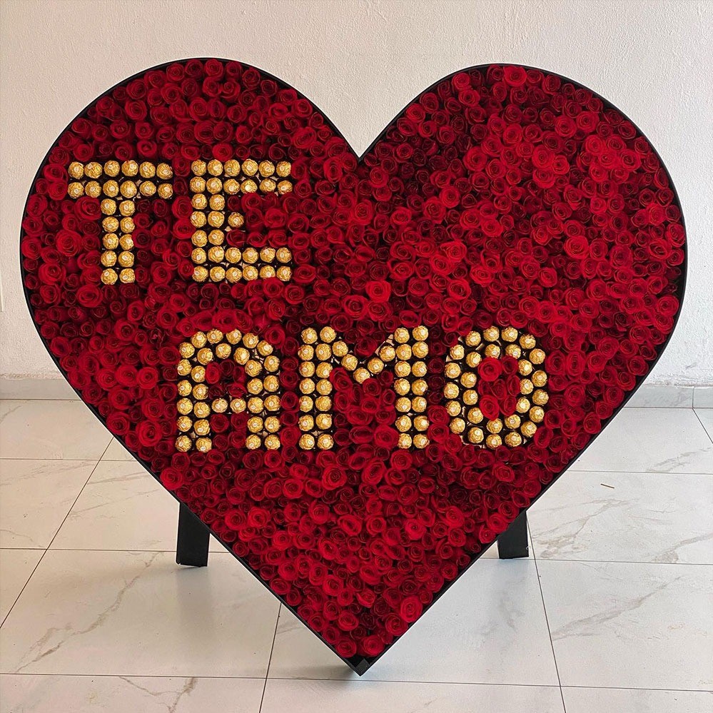 Magnífico diseño de corazón elaborado con 1,000 rosas en color rojo y letras te amo con chocolate Ferrero.