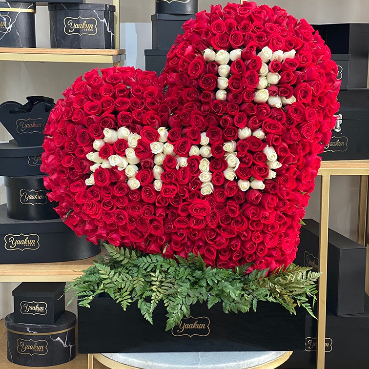 Expresa lo que sientes con este precioso diseño floral en forma de corazón elaborado de 400 rosas rojas y las palabras “Te Amo” en rosas blancas, montado en posición inclinada sobre una base de madera con follaje de clavo japonés. Mide aproximadamente 90 cm de altura.