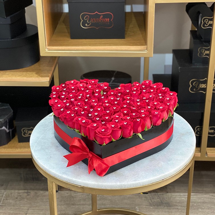 100 rosas rojas en caja corazón con pines de cristal.