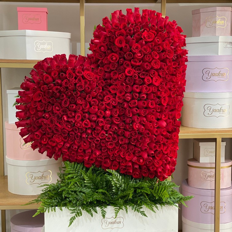 Hermoso arreglo floral con 500 rosas rojas en forma de corazón en caja blanca