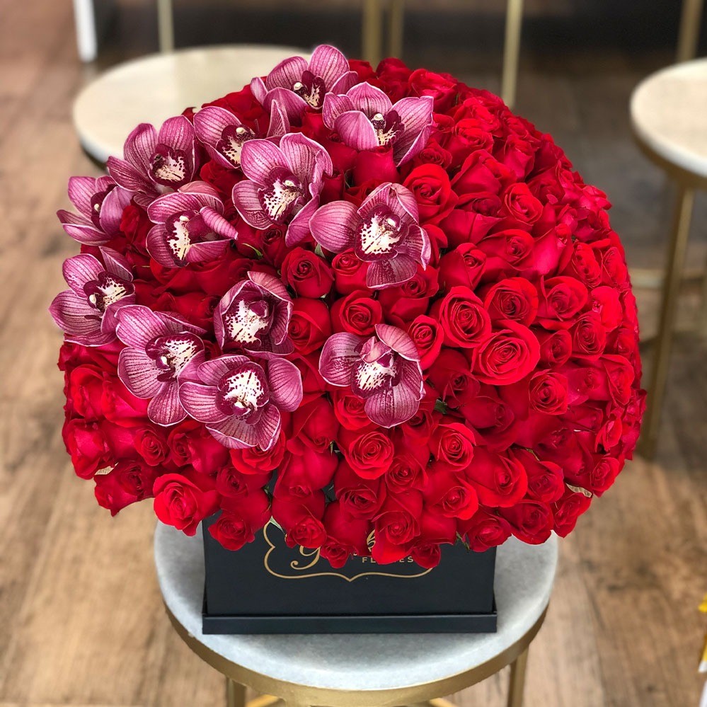 Demuestra tu interés con esta sofisticada y atractiva esfera elaborada con 300 rosas rojas y aproximadamente 13 orquídeas rosas sobre una caja Yaakun Premium en color negro.